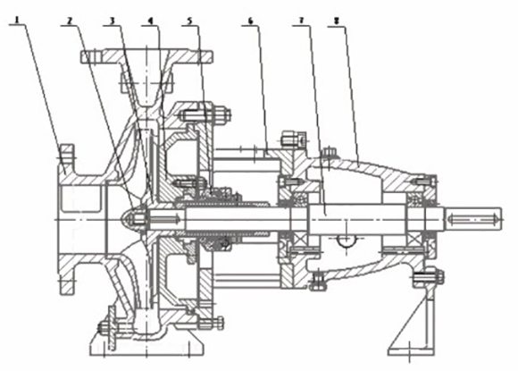 (1)泵體;(2)葉輪螺母(mǔ);(3)葉輪件;(4)泵蓋;(5)密封(feng)部件;(6)中間支架;(7)軸(zhou)🏒;(8)懸架部件