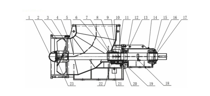 1-導流(liú)罩 2-入口短節 3-葉(yè)輪 4-泵體 5-軸 6-襯套(tào) 7-軸套 8-水封環 9-水(shuǐ)封🛀🏻環填料壓蓋(gài) -10填料壓 12-軸面座(zuò) 13-軸承 14-氣孔蓋 15-軸(zhóu)承擋套 16-後🔴軸承(chéng)壓蓋 17-後擋醋盤(pan) -18油垃部位 -19前軸(zhóu)毋壓蓋 -20前🏒擋酸(suān)盤 -21洩液管 22-管接(jie)頭🈲 23-軸唱墊🌈采用(yong)懸臂式結構,結(jie)😍構簡單,維修方(fāng)便,不😄用拆卸泵(beng)體和管線,葉輪(lun)反裝即可改變(bian)介質流向。